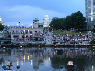 Søndag tog vi så ind til Providence. Først var vi rundt i den flotte by, og da det blev for varmt midt på dagen gik vi i air-conditioneret mall med biograf (Barbie) og spiste cheasecake😊 Vi fik også set live musik fra flere forskellige scener som var opsat i byen. Om aftenen, efter et kortvarigt voldsomt regnvejr, var vi klar til WaterFire festivalen. På den store kanal/flod som går gennem byen var der placeret bålpladser for hver 10-20 meter. Og langs bredderne var der højttalere som spillede musik. Efter solnedgang sejlede de rundt med musik og dansere og tændte alle bålene. Så kunne man vandre langs floden, se lysene og købe (dyre) fadøl eller snacks i boderne som var opstillet. Det var en utrolig flot oplevelse som man med fordel kunne lave i København også. En ren ”total teater” sanse oplevelse.