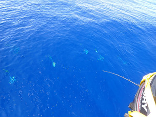 Næste morgen kom så turens anden store naturoplevelse: Iris gik bagud for at rense fiskelinen for tang og så at seks mellemstore Mahi Mahier fulgte efter båden. De hedder også Dolphin Fish, vist nok netop fordi de følger bådene ligesom delfiner: det havde vi ikke set før nu!