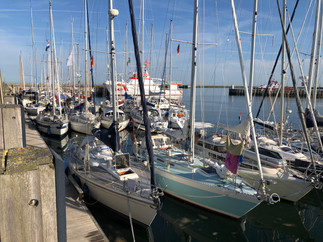 Vi kom derefter ind i havnen hvor der er meget få pladser på langs, og alle blot ligger udenpå hinanden. Vi kom i 7. række, heldigvis var der ikke meget vind. Så alt var ok indtil den næst-inderste annoncerede at de skulle sejle kl 0600 næste morgen. Altså vækkeur til alle 😊. Vi havde egentlig planlagt at sejle ved 7-tiden (vind, tidevand og timing til ankomst i Holland) men tog så også bare tidligt afsted og spiste morgenmad undervejs.