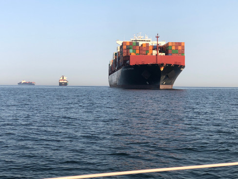 Tirsdag den 19.7 sejlede vi så mod Holland. Der var hedebølge så vi sejlede i badebukser og tog brusebad på dækket, det havde vi ikke forventet før Spanien:-) Undervejs kom vi forbi flere ankerpladser hvor de store containerskibe venter på indsejling til Hamburg. Over radioen blev et ankommende skib spurgt til planerne, deres ETA til Hamburg var 3. august, dvs de skulle ligge 14 dage og vente.